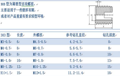 淄博自攻螺套外观上看主要有两种区分,一种是一端开槽型的,另一种是一端三圆孔型的,其中开圆孔型的又分为307型和308型两种,307型和308型外观主要区别就是同一直径下,长度和外径大小有所区分。以上各种型式螺套均具有自行攻牙功能。